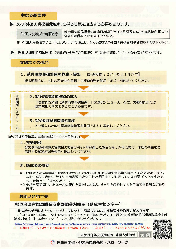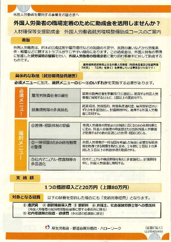 外国人労働者は、日本の労働法制や雇用慣行などの知識不足や、言語の違いなどから労働条件・解雇などに関するトラブルが生じやすい傾向にあります。この助成金は、外国人特有の事情に配慮した就労環境の整備を行い、外国人労働者の職場定着に取組に対して助成するものです。